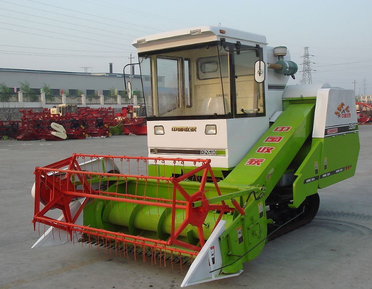 收割机.它是一体化收割农作物的机械。一次性完成收割、脱粒,并将谷粒集中到储藏仓,然后在通过传送带将粮食输送到运输车上。也可用人工收割,将稻、麦等作物的禾秆铺放在田间,然后再用谷物收获机械进行捡拾脱粒。