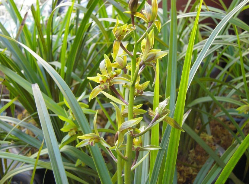 叶鞘,常多个假鳞茎连在一起,成排同时存在。叶线形或剑形,革质,直立或下垂,花单生或成总状花序,花梗上着生多数苞片。花两性,具芳香。花冠由3枚萼片